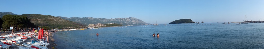 Sahilden bahsedeyim. Karadağ’da kumsal yok denmekte. Burada da sanki inşaat artıkları bir makinadan geçirilip granülsel bir yapıya sokulup yayılmış gibi. Denizin içi de bu düşüncemi doğrular nitelikte. Hızlıca derinleşiyor burası da. Ama ilerledikçe üstüne bastığım ince taşların ayaklarımın altından benimle beraber aşağılara kaydığını hissediyorum. Açılıyorum biraz. Gözlerim ise eşyalarımın üzerinde. Adaya giden yolda ise görevliler gidip gelmekte. Parti gibi bir şey olacak sanırım. Zaten bugün Budva’da sezon açılış partisi var.