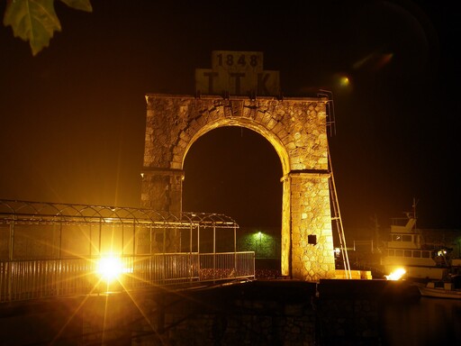 Daha da doğuya doğru gittik. Suyun ortasında üzerinde 1848 yazan, ışıklandırılmış bir kapı var. Uzaktan kapı değil de zafer takı gibi görünmekte. Sahilde çayhane gibi yerin sahiplerinden destur alıp içeride bize sürekli havlayan köpekten kendimizi sakınarak görüntü almaya koyulduk. Kara ile kapının arasındaki ulaşım saç bir levhadan bozma köprü ile sağlanmakta. Ortasına dek ilerledim ama attığım adımlar gitgide yaylanma hissi uyandırınca karada bekleyen Uğur ‘un da ikazı ile döndüm. (mantıklı bir hareket yapmışım)