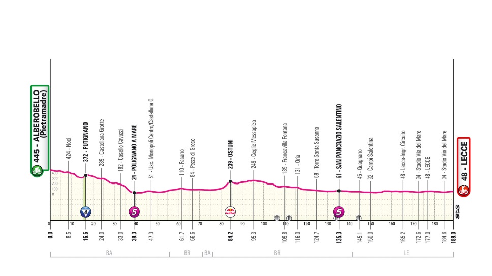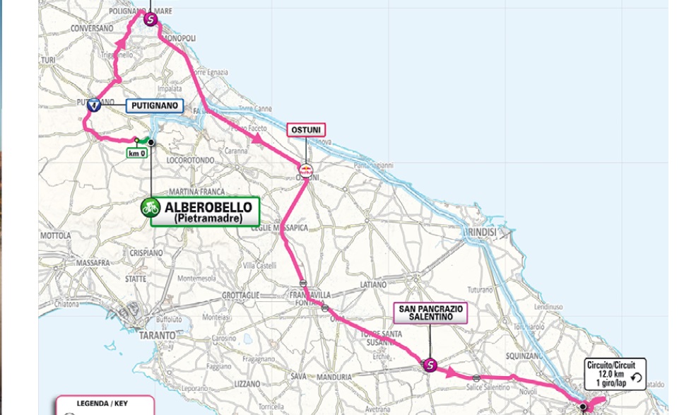 Putignano’da sadece bir kısa tırmanışı olan düz bir etap. Büyük şehirler geniş, çoğunlukla düz yollarla birbirine bağlı. Lecce’de bisikletçiler varış alanından ilk geçişten hemen sonra son etaba giriyorlar. Bitiş çizgisini geçmeden ve bir tam turu tamamlamadan önce yaklaşık 12 km’lik parkurun tamamını kat edecekler.